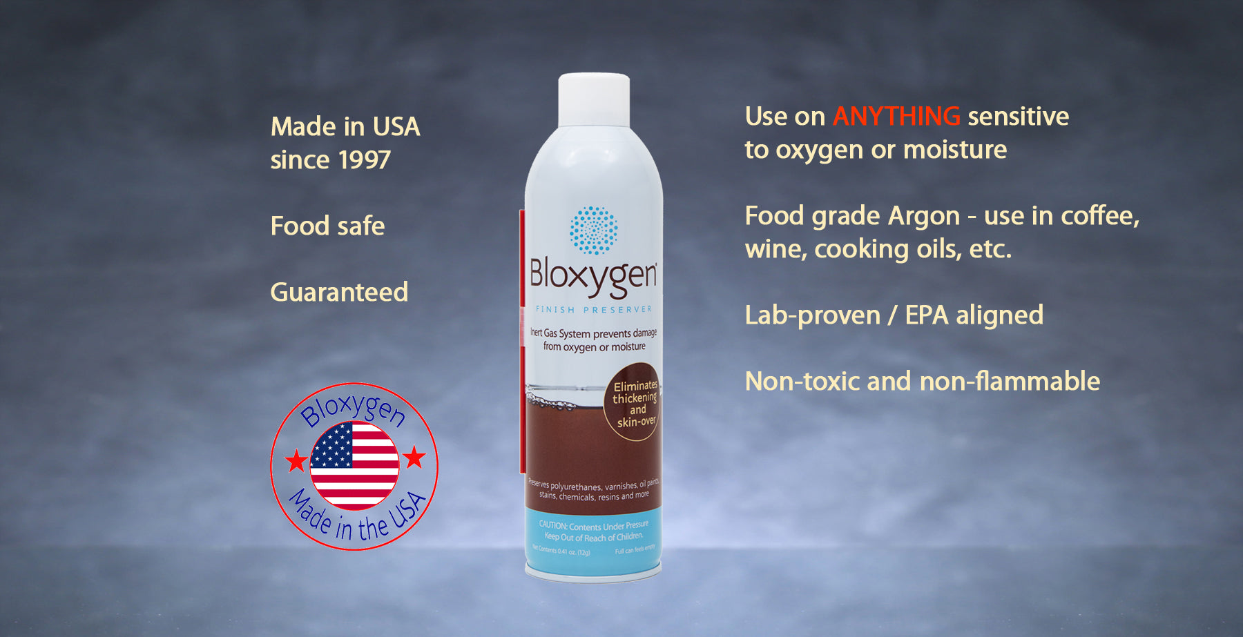 Save your leftover paints, finishes or food from getting ruined by oxygen or moisture. Simply spray, seal and store for up to 10 years. Never have hardened paint or rubbery finishes ruin your day. Safe for food, coffee, cannabis. Tested by manufacturers. Industry best practice.